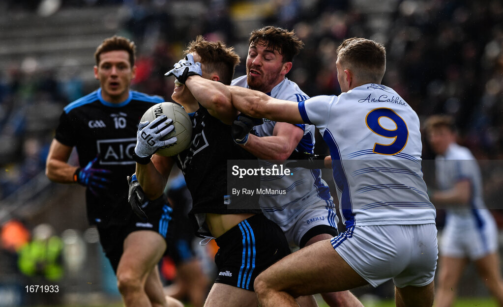 24 March 2019; Con O’Callaghan of Dublin is tackled by Conor Moynagh and Killian Clarke, 9, of Cavan during the Allianz Football League Division 1 Round 7 match between Cavan and Dublin at Kingspan Breffni in Cavan. Photo by Ray McManus/Sportsfile