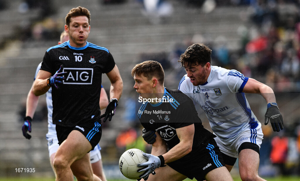 24 March 2019; Con O’Callaghan of Dublin supported by Paul Flynn, left, in action against Conor Moynagh of Cavan during the Allianz Football League Division 1 Round 7 match between Cavan and Dublin at Kingspan Breffni in Cavan. Photo by Ray McManus/Sportsfile