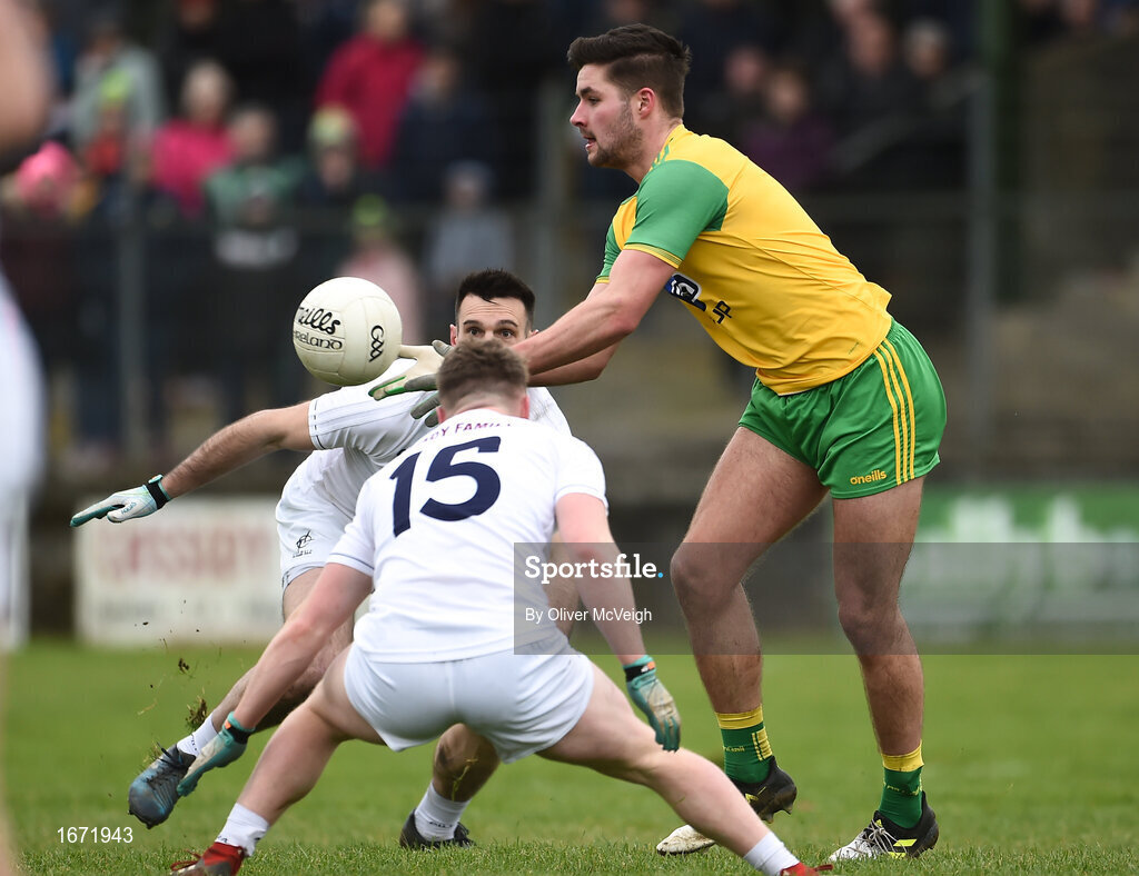 24 March 2019; Caolan McGonigle of Donegal in action against Eoin Doyle and Jimmy Hyland of Kildare during the Allianz Football League Division 2 Round 7 match between Donegal and Kildare at Fr. Tierney Park in Ballyshannon, Donegal. Photo by Oliver McVeigh/Sportsfile