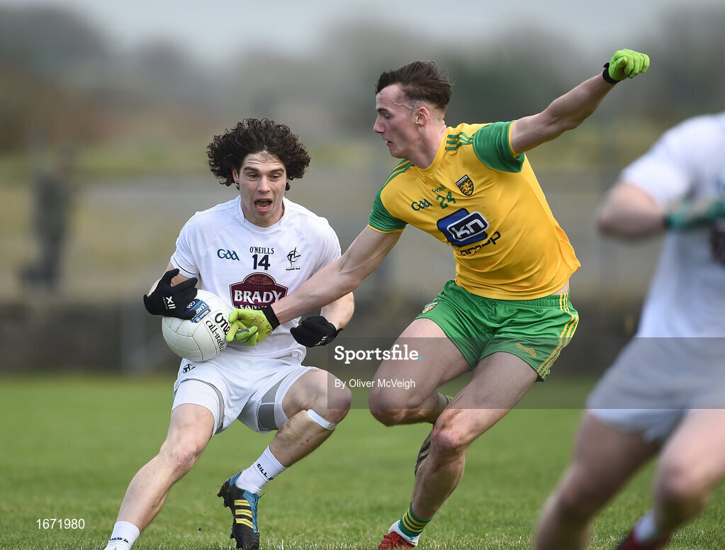 24 March 2019; Chris Healy of Kildare in action against Jason McGee of Donegal during the Allianz Football League Division 2 Round 7 match between Donegal and Kildare at Fr. Tierney Park in Ballyshannon, Donegal. Photo by Oliver McVeigh/Sportsfile