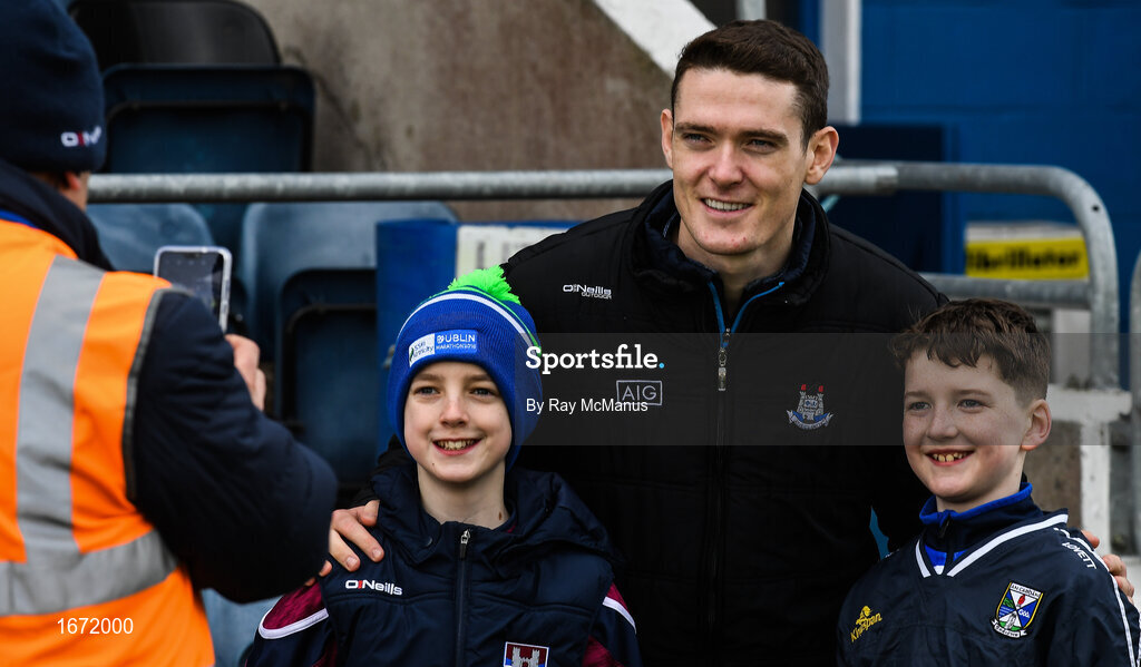 24 March 2019; Dublin's Brian fenton poses for a picture with Cavan supporters Sean, 12 years, and his brother Dara Lovett, 10, from Ballyjamesduff, before the Allianz Football League Division 1 Round 7 match between Cavan and Dublin at Kingspan Breffni in Cavan. Photo by Ray McManus/Sportsfile