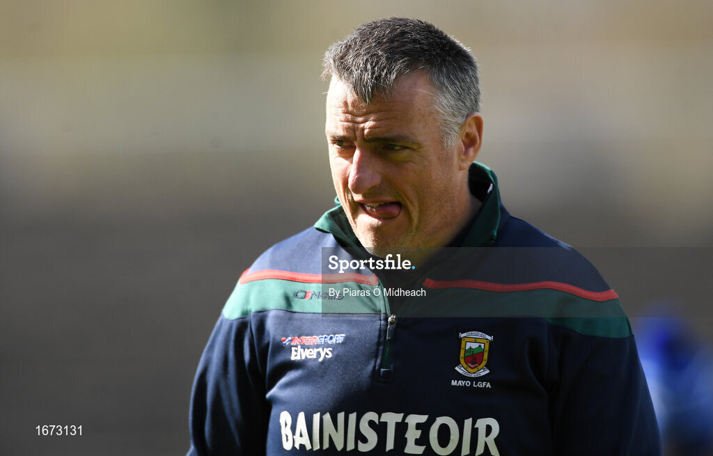 24 March 2019; Mayo manager Peter Leahy dejected after the Lidl Ladies NFL Round 6 match between Mayo and Cork at Elverys MacHale Park in Castlebar, Mayo. Photo by Piaras Ó Mídheach/Sportsfile