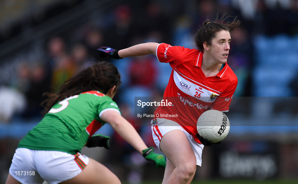 24 March 2019; Ciara O'Sullivan of Cork in action against Róisín Flynn of Mayo during the Lidl Ladies NFL Round 6 match between Mayo and Cork at Elverys MacHale Park in Castlebar, Mayo. Photo by Piaras Ó Mídheach/Sportsfile