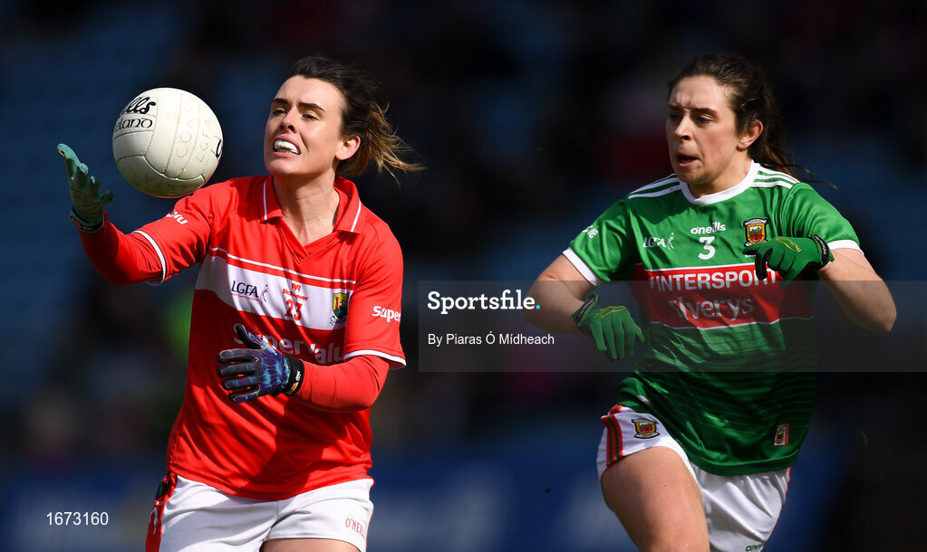 24 March 2019; Doireann O'Sullivan of Cork in action against Róisín Flynn of Mayo during the Lidl Ladies NFL Round 6 match between Mayo and Cork at Elverys MacHale Park in Castlebar, Mayo. Photo by Piaras Ó Mídheach/Sportsfile