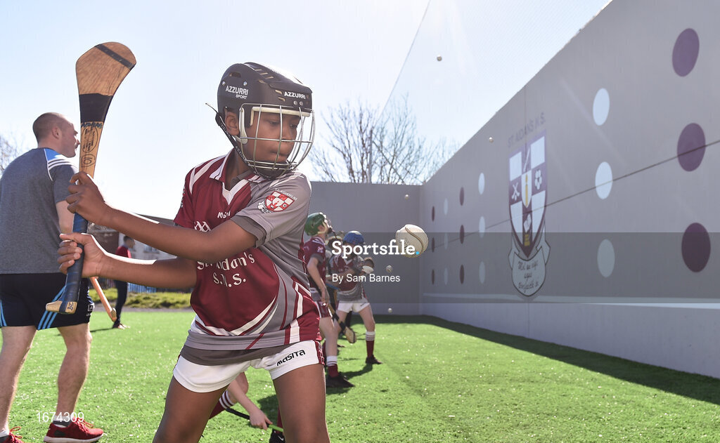28 March 2019; St Aidan's SNS, in conjunction with the Lauritzen foundation, opened their state of the art hurling wall on the school grounds today. St Aidan's SNS strive to improve physical fitness and participation in Gaelic games amongst its pupils as well as building upon existing relationships within the community and the local GAA club in Tallaght, St Marks. In attendance at the launch is Zuriel Chucks, aged 11, at the St Aidan's SNS hurling wall opening ceremony at St Aidans Senior National School in Tallaght, Dublin. Photo by Sam Barnes/Sportsfile