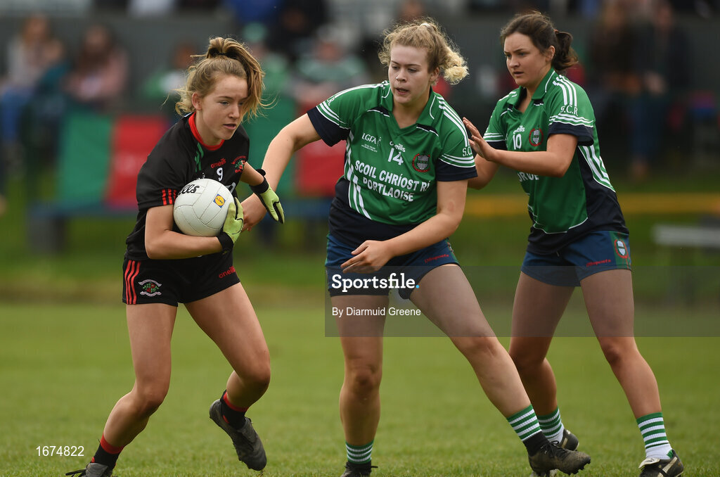30 March 2019; Brid McMaugh of Loreto, Clonmel in action against Alice Dunne, centre, and Erone Fitzpatrick of Scoil Chríost Rí, Portlaoise during the Lidl All-Ireland Post-Primary Schools Senior A Final match between Loreto, Clonmel, and Scoil Chríost Rí, Portlaoise, at John Locke Park in Callan, Co Kilkenny. Photo by Diarmuid Greene/Sportsfile