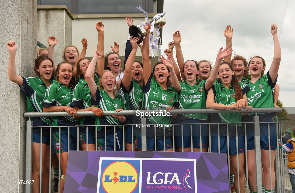 30 March 2019; Scoil Chríost Rí captain Erone Fitzpatrick lifts the cup after the Lidl All-Ireland Post-Primary Schools Senior A Final match between Loreto, Clonmel, and Scoil Chríost Rí, Portlaoise, at John Locke Park in Callan, Co Kilkenny. Photo by Diarmuid Greene/Sportsfile
