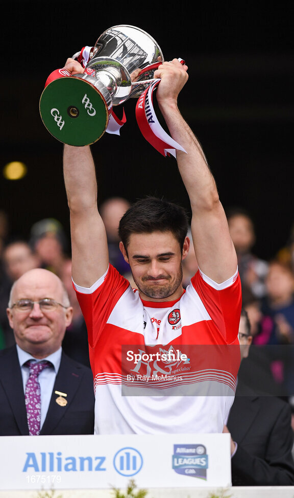 30 March 2019; Derry captain Christopher McKaigue lifts the cup after the Allianz Football League Division 4 Final between Derry and Leitrim at Croke Park in Dublin. Photo by Ray McManus/Sportsfile