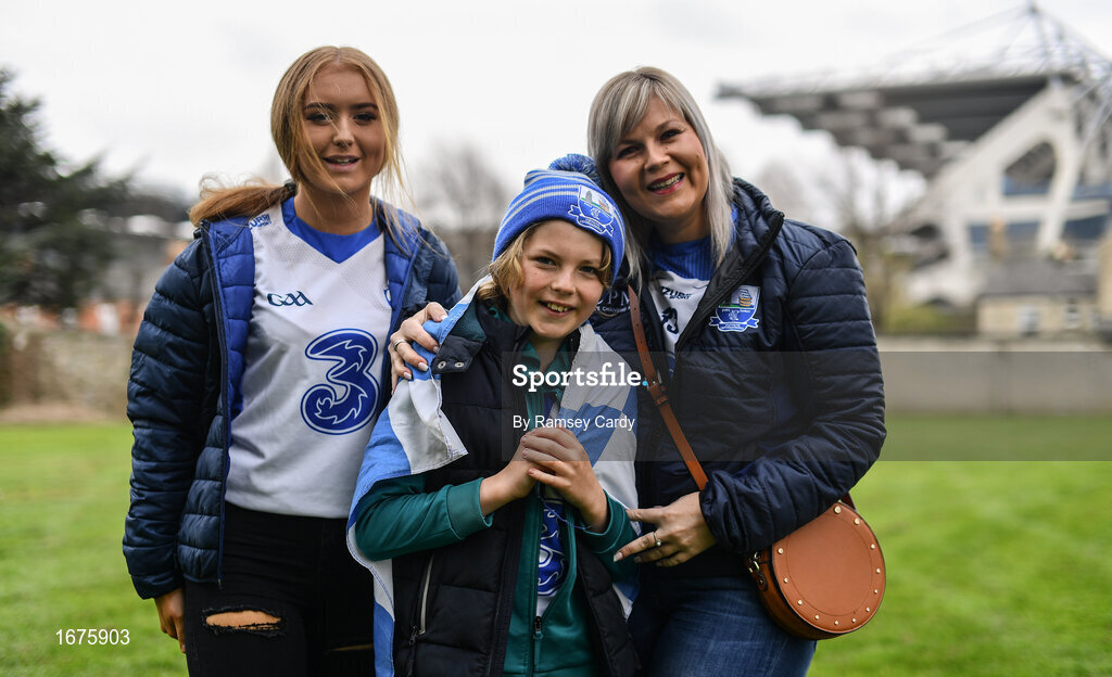 31 March 2019; Waterford supporters, from left, Aoibheann O'Grady, Micheál O'Grady and Alana Carmody, from Dungarvan, Co. Waterford, ahead of the Allianz Hurling League Division 1 Final match between Limerick and Waterford at Croke Park in Dublin. Photo by Ramsey Cardy/Sportsfile