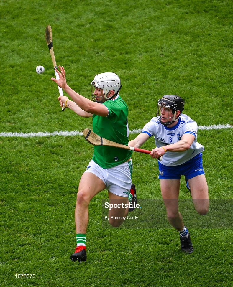 31 March 2019; Aaron Gillane of Limerick in action against Calum Lyons of Waterford during the Allianz Hurling League Division 1 Final match between Limerick and Waterford at Croke Park in Dublin. Photo by Ramsey Cardy/Sportsfile