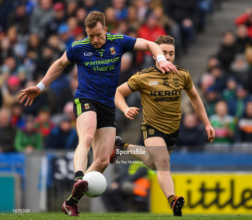 31 March 2019; Donal Vaughan of Mayo in action against Dara Moynihan of Kerry during the Allianz Football League Division 1 Final match between Kerry and Mayo at Croke Park in Dublin. Photo by Ray McManus/Sportsfile