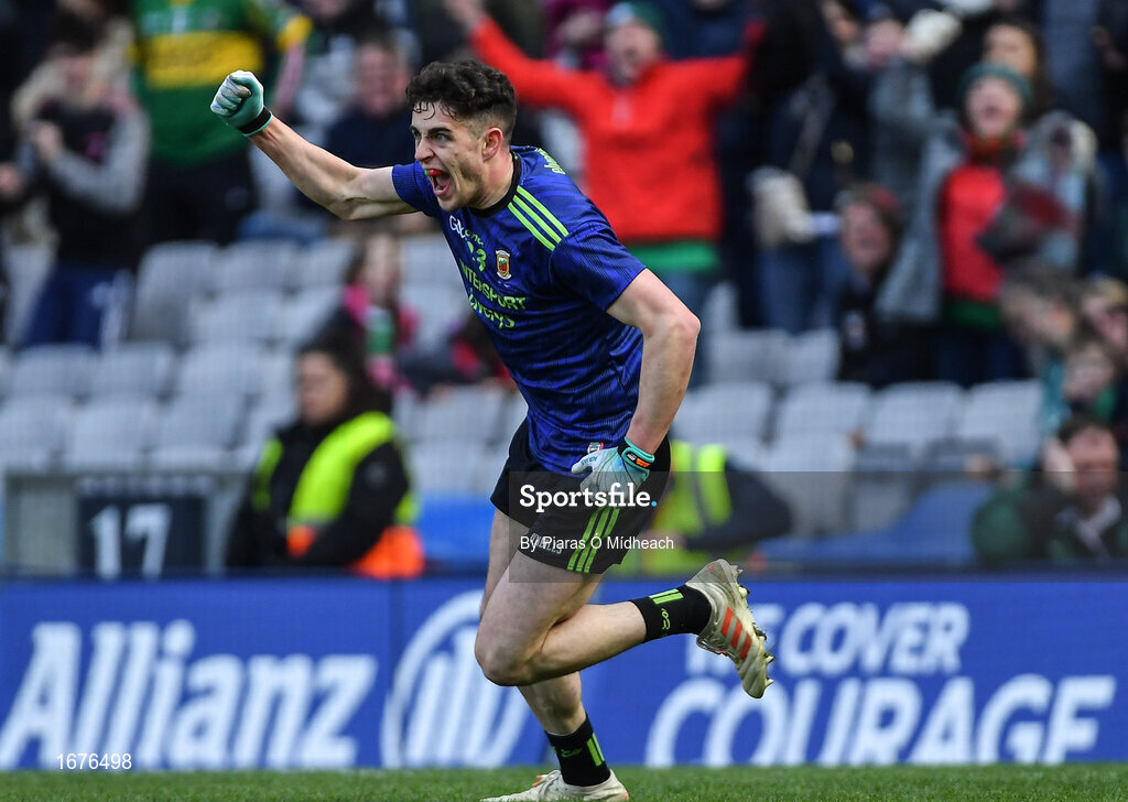 31 March 2019; Ciarán Treacy of Mayo celebrates scoring his side's third goal during the Allianz Football League Division 1 Final match between Kerry and Mayo at Croke Park in Dublin. Photo by Piaras Ó Mídheach/Sportsfile