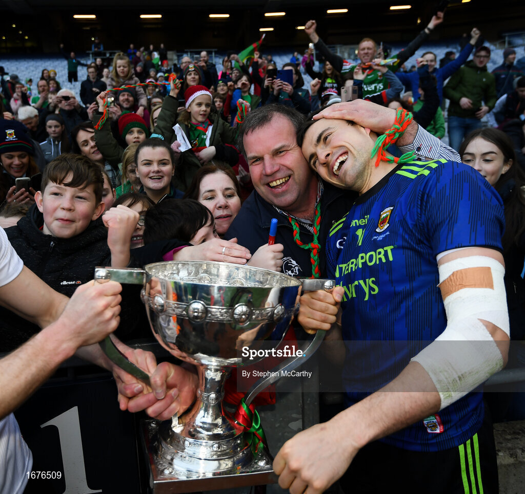 31 March 2019; Jason Doherty of Mayo celebrates with supporters following the Allianz Football League Division 1 Final match between Kerry and Mayo at Croke Park in Dublin. Photo by Stephen McCarthy/Sportsfile
