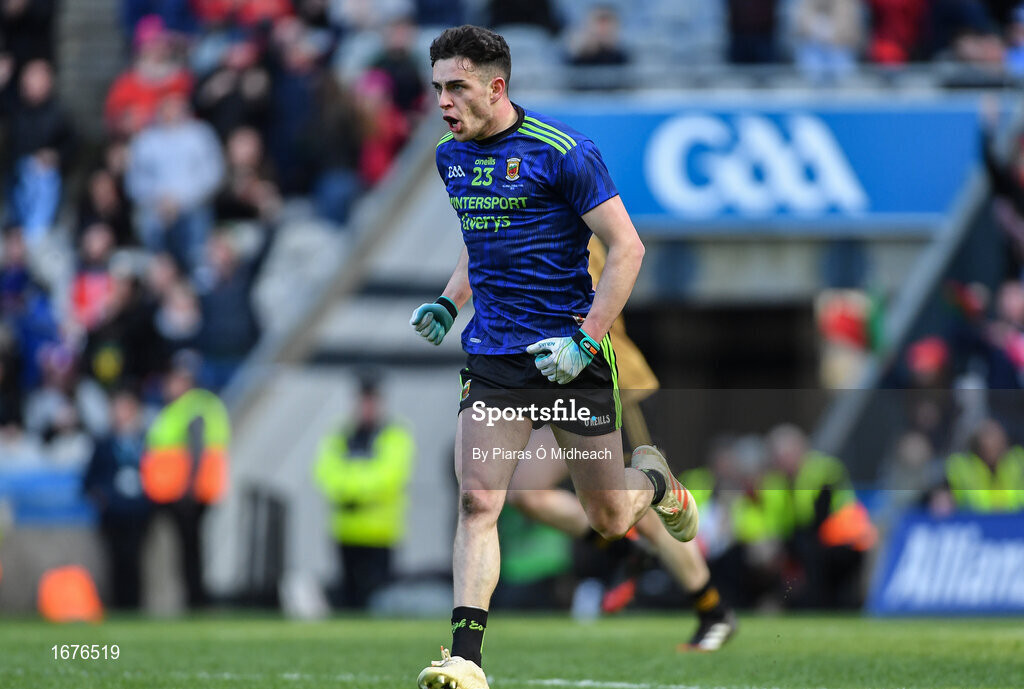 31 March 2019; Ciarán Treacy of Mayo celebrates scoring his side's third goal during the Allianz Football League Division 1 Final match between Kerry and Mayo at Croke Park in Dublin. Photo by Piaras Ó Mídheach/Sportsfile