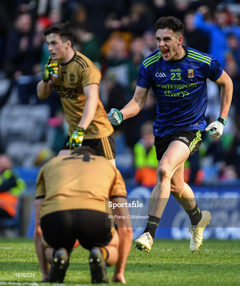31 March 2019; Ciarán Treacy of Mayo celebrates scoring his side's third goal during the Allianz Football League Division 1 Final match between Kerry and Mayo at Croke Park in Dublin. Photo by Piaras Ó Mídheach/Sportsfile