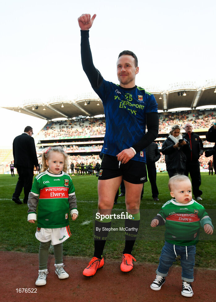 31 March 2019; Andy Moran of Mayo and his children Ollie and Charlotte celebrate following the Allianz Football League Division 1 Final match between Kerry and Mayo at Croke Park in Dublin. Photo by Stephen McCarthy/Sportsfile