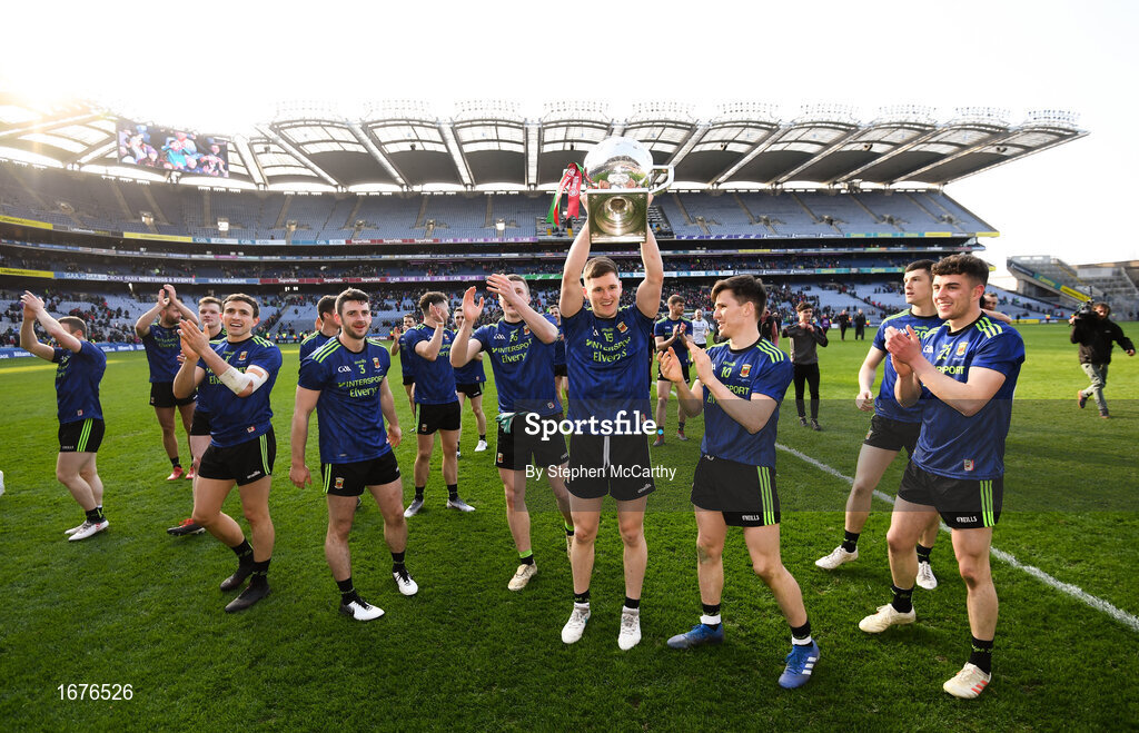 31 March 2019; James Carr and his Mayo team-mates celebrate following the Allianz Football League Division 1 Final match between Kerry and Mayo at Croke Park in Dublin. Photo by Stephen McCarthy/Sportsfile