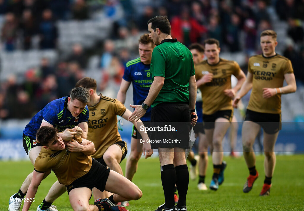 31 March 2019; Seán O'Shea of Kerry and Patrick Durcan of Mayo tussle during the Allianz Football League Division 1 Final match between Kerry and Mayo at Croke Park in Dublin. Photo by Stephen McCarthy/Sportsfile