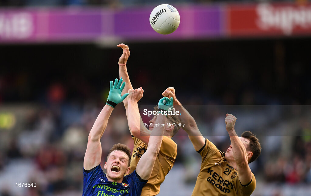 31 March 2019; Matthew Ruane of Mayo in action against Diarmuid O'Connor and Mark Griffin, right, of Kerry during the Allianz Football League Division 1 Final match between Kerry and Mayo at Croke Park in Dublin. Photo by Stephen McCarthy/Sportsfile