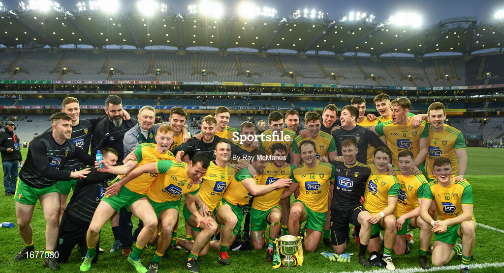 30 March 2019; The Donergal squad celebrate with the cup after during the Allianz Football League Division 2 Final match between Meath and Donegal at Croke Park in Dublin. Photo by Ray McManus/Sportsfile