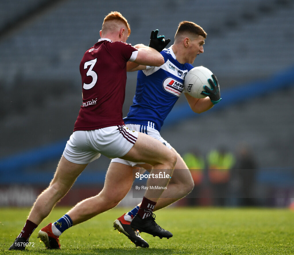 6 April 2019; Evan O’Carroll of Laois in action against Ronan Wallace of Westmeath during the Allianz Football League Division 3 Final match between Laois and Westmeath at Croke Park in Dublin. Photo by Ray McManus/Sportsfile