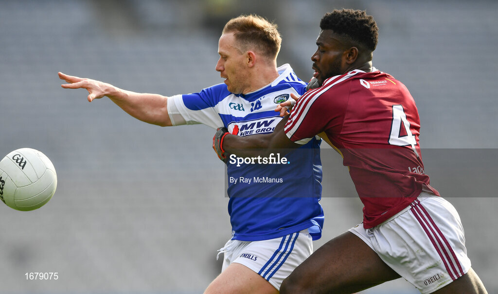 6 April 2019; Paul Cahillane of Laois in action against Boidu Sayeh of Westmeath during the Allianz Football League Division 3 Final match between Laois and Westmeath at Croke Park in Dublin. Photo by Ray McManus/Sportsfile