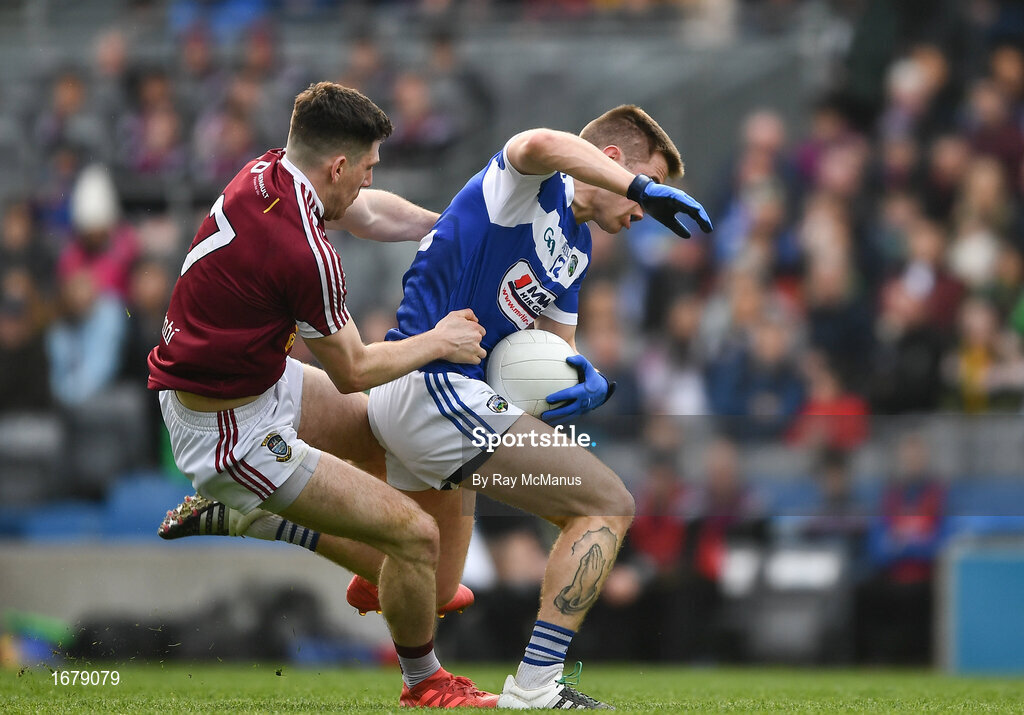 6 April 2019; James Dolan of Westmeath drags down Marty Scully of Laois, for which he received a black card, during the Allianz Football League Division 3 Final match between Laois and Westmeath at Croke Park in Dublin. Photo by Ray McManus/Sportsfile