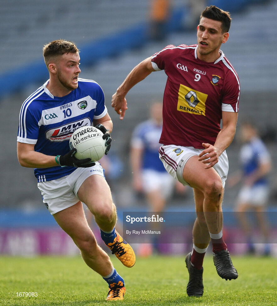 6 April 2019; Eoin Lowry of Laois in action against Denis Corroon of Westmeath during the Allianz Football League Division 3 Final match between Laois and Westmeath at Croke Park in Dublin. Photo by Ray McManus/Sportsfile