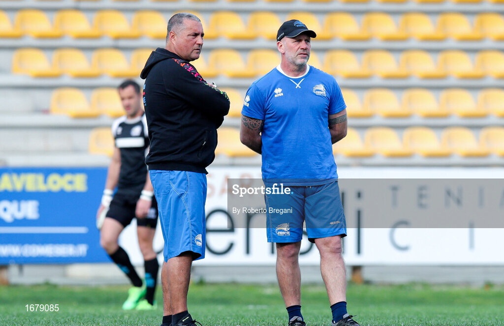6 April 2019; Zebre head coach Michael Bradley and backs coach Alessandro Troncon during the warm-up prior to the Guinness Pro14 Round 19 game between Zebre Rugby Club and Connacht Rugby at Stadio Lanfranchi in Parma, Italy. Photo by Roberto Bregani/Sportsfile