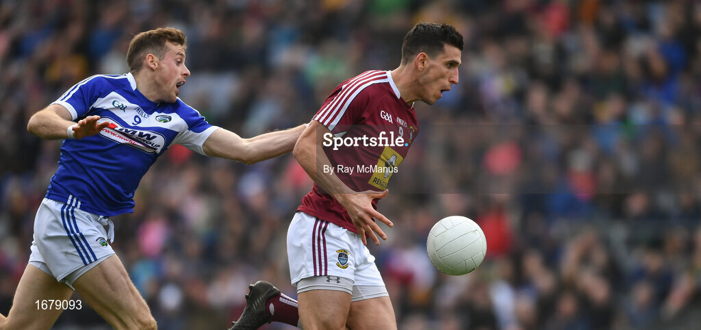 6 April 2019; Denis Corroon of Westmeath in action against Kieran Lillis of Laois during the Allianz Football League Division 3 Final match between Laois and Westmeath at Croke Park in Dublin. Photo by Ray McManus/Sportsfile
