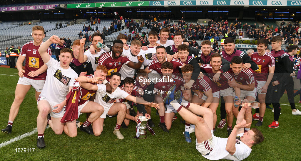 6 April 2019; The Westmeath players celebrate with the cup afterthe Allianz Football League Division 3 Final match between Laois and Westmeath at Croke Park in Dublin. Photo by Ray McManus/Sportsfile