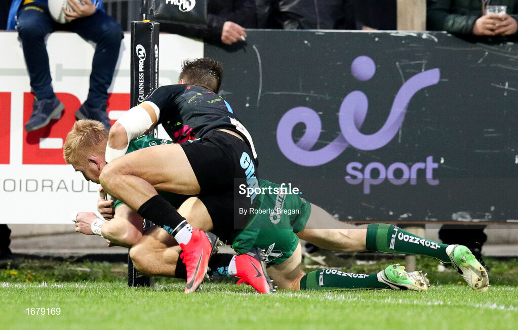 6 April 2019; Darragh Leader of Connacht Rugby scores a try which is then invalidated by the referee Ben Blain during the Guinness PRO14 Round 19 game between Zebre Rugby Club and Connacht Rugby at Stadio Lanfranchi in Parma, Italy. Photo by Roberto Bregani/Sportsfile