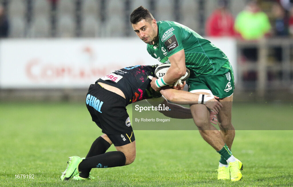 6 April 2019; Tiernan O’Halloran of Connacht is tackled by Francois Brummer of Zebre during the Guinness PRO14 Round 19 game between Zebre Rugby Club and Connacht Rugby at Stadio Lanfranchi in Parma, Italy. Photo by Roberto Bregani/Sportsfile