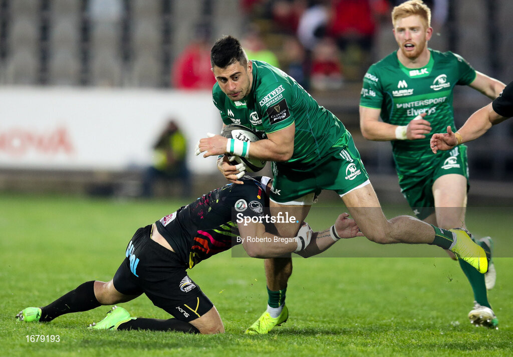 6 April 2019; Tiernan O’Halloran of Connacht is tackled by Francois Brummer of Zebre during the Guinness PRO14 Round 19 game between Zebre Rugby Club and Connacht Rugby at Stadio Lanfranchi in Parma, Italy. Photo by Roberto Bregani/Sportsfile