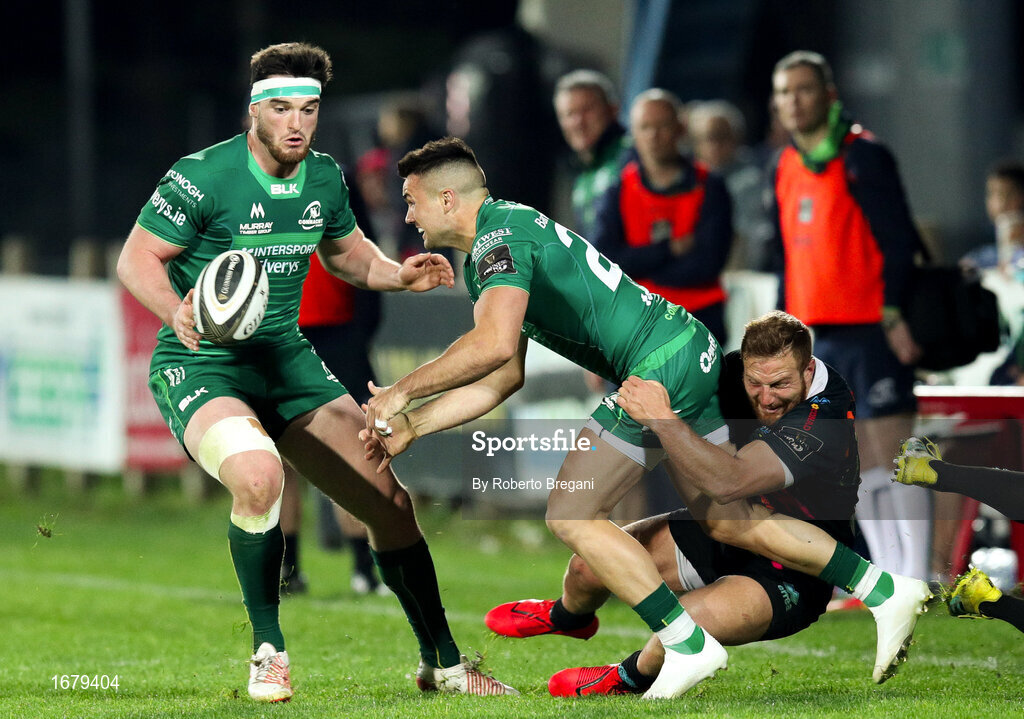 6 April 2019; Cian Kelleher of Connacht offloads the ball to Tom Daly as he is tackled by Giulio Bisegni of Zebre during the Guinness Pro14 Round 19 game between Zebre Rugby Club and Connacht Rugby at Stadio Lanfranchi in Parma, Italy. Photo by Roberto Bregani/Sportsfile