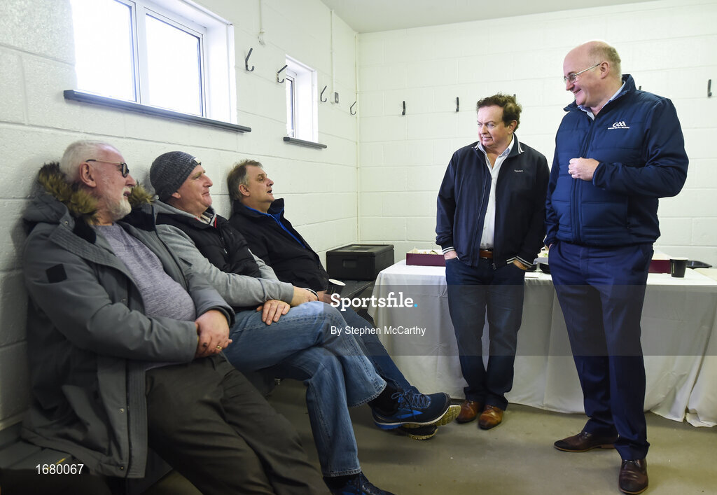 8 April 2019; Uachtarán Chumann Lúthchleas Gael John Horan and RTÉ gaelic games correspondent Marty Morrissey speaking to members of the Meath Coast Men's Shed at the unveiling of the new GAA manifesto in both Irish and English at St Colmcilles GAA Club in Bettystown, Co Meath. The manifesto is an affirmation of the GAA's mission, vision and values, and a celebration of all the people who make the Association what it is. The intention is for the manifesto to be proudly displayed across the GAA network and wherever Gaelic Games are played at home and abroad". It marks the start of a wider support message that celebrates belonging to the GAA, which is centered around the statement: ‘GAA – Where We All Belong’ / CLG – Tá Áit Duinn Uilig’. Photo by Stephen McCarthy/Sportsfile