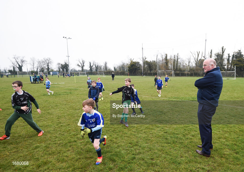 8 April 2019; Uachtarán Chumann Lúthchleas Gael John Horan watches on as juvenile members of St Colmcilles GAA Club participate in a game prior to the unveiling of the new GAA manifesto in both Irish and English at St Colmcilles GAA Club in Bettystown, Co Meath. The manifesto is an affirmation of the GAA's mission, vision and values, and a celebration of all the people who make the Association what it is. The intention is for the manifesto to be proudly displayed across the GAA network and wherever Gaelic Games are played at home and abroad". It marks the start of a wider support message that celebrates belonging to the GAA, which is centered around the statement: ‘GAA – Where We All Belong’ / CLG – Tá Áit Duinn Uilig’. Photo by Stephen McCarthy/Sportsfile