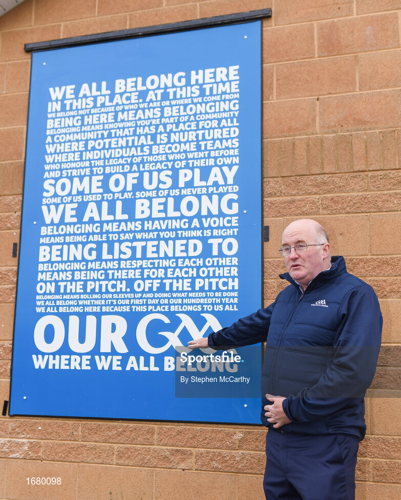 8 April 2019; Uachtarán Chumann Lúthchleas Gael John Horan at the unveiling of the new GAA manifesto in both Irish and English at St Colmcilles GAA Club in Bettystown, Co Meath. The manifesto is an affirmation of the GAA's mission, vision and values, and a celebration of all the people who make the Association what it is. The intention is for the manifesto to be proudly displayed across the GAA network and wherever Gaelic Games are played at home and abroad". It marks the start of a wider support message that celebrates belonging to the GAA, which is centered around the statement: ‘GAA – Where We All Belong’ / CLG – Tá Áit Duinn Uilig’. Photo by Stephen McCarthy/Sportsfile