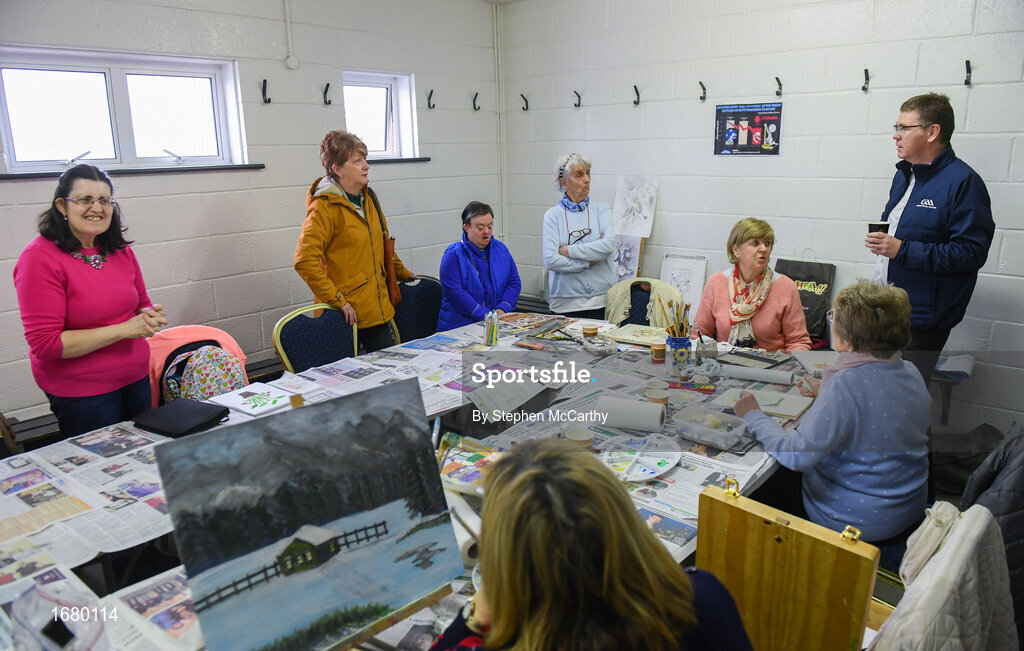 8 April 2019; Ard Stiúrthóir of the GAA Tom Ryan speaking with members of the St Colmcilles GAA Club art class following the unveiling of the new GAA manifesto in both Irish and English at St Colmcilles GAA Club in Bettystown, Co Meath. The manifesto is an affirmation of the GAA's mission, vision and values, and a celebration of all the people who make the Association what it is. The intention is for the manifesto to be proudly displayed across the GAA network and wherever Gaelic Games are played at home and abroad". It marks the start of a wider support message that celebrates belonging to the GAA, which is centered around the statement: ‘GAA – Where We All Belong’ / CLG – Tá Áit Duinn Uilig’. Photo by Stephen McCarthy/Sportsfile