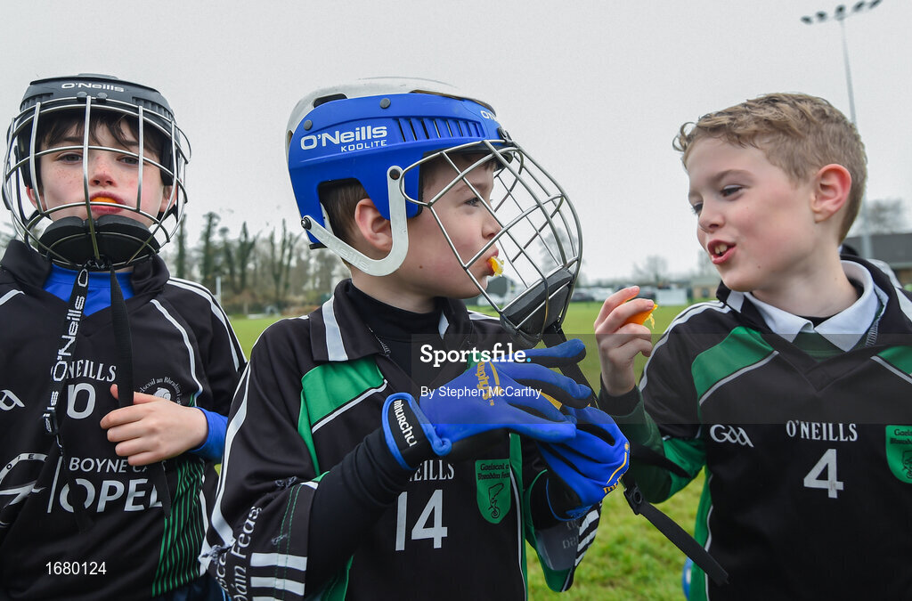 8 April 2019; Peadar Seamus Ó Mathúna, left, Ruairí Ó Neill and Finn O Neill, 4, all age 9, from Gaelscoil an Bhradáin Feasa, enjoy half time oranges at the unveiling of the new GAA manifesto in both Irish and English at St Colmcilles GAA Club in Bettystown, Co Meath. The manifesto is an affirmation of the GAA's mission, vision and values, and a celebration of all the people who make the Association what it is. The intention is for the manifesto to be proudly displayed across the GAA network and wherever Gaelic Games are played at home and abroad". It marks the start of a wider support message that celebrates belonging to the GAA, which is centered around the statement: ‘GAA – Where We All Belong’ / CLG – Tá Áit Duinn Uilig’. Photo by Stephen McCarthy/Sportsfile