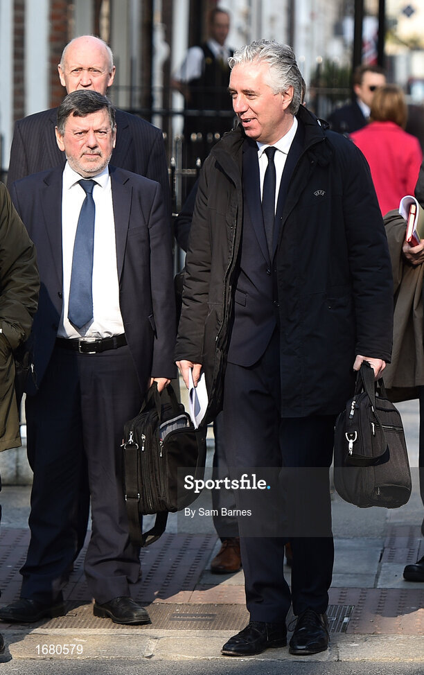 10 April 2019; FAI President Donal Conway, left, and John Delaney, Executive Vice President of The Football Association of Ireland attending a meeting with the Oireachtas Committee on Sport at Dáil Éireann in Dublin. Photo by Sam Barnes/Sportsfile