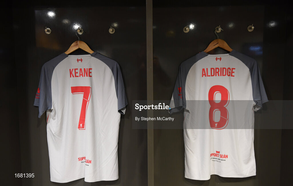 12 April 2019; A detailed view of the Liverpool FC Legends jerseys of Robbie Keane and John Aldridge prior to the Sean Cox Fundraiser match between the Republic of Ireland XI and Liverpool FC Legends at the Aviva Stadium in Dublin. Photo by Stephen McCarthy/Sportsfile.