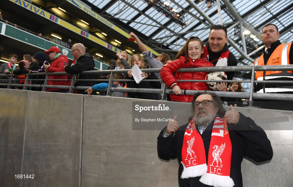 12 April 2019; Actor Ricky Tomlinson with supporters prior to the Sean Cox Fundraiser match between the Republic of Ireland XI and Liverpool FC Legends at the Aviva Stadium in Dublin. Photo by Stephen McCarthy/Sportsfile.