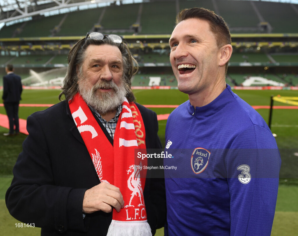 12 April 2019; Actor Ricky Tomlinson with Robbie Keane of Republic of Ireland XI prior to the Sean Cox Fundraiser match between the Republic of Ireland XI and Liverpool FC Legends at the Aviva Stadium in Dublin. Photo by Stephen McCarthy/Sportsfile.