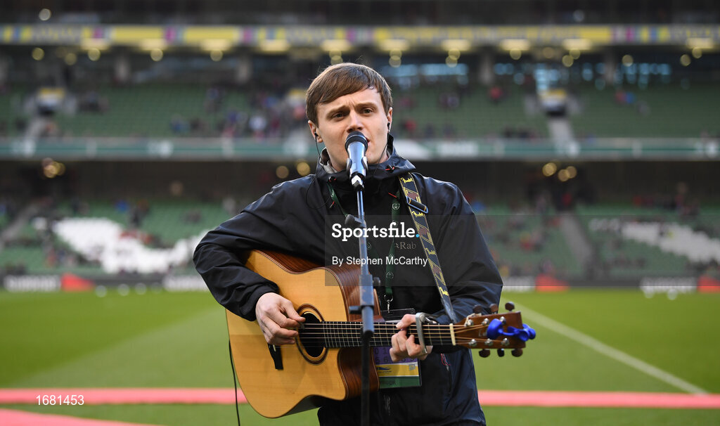 12 April 2019; Musician Jamie Webster performs prior to the Sean Cox Fundraiser match between the Republic of Ireland XI and Liverpool FC Legends at the Aviva Stadium in Dublin. Photo by Stephen McCarthy/Sportsfile.