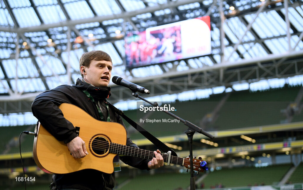 12 April 2019; Musician Jamie Webster performs prior to the Sean Cox Fundraiser match between the Republic of Ireland XI and Liverpool FC Legends at the Aviva Stadium in Dublin. Photo by Stephen McCarthy/Sportsfile.