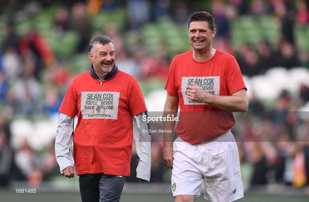 12 April 2019; John Aldridge, left, of Liverpool FC Legends and Niall Quinn of Republic of Ireland XI prior to the Sean Cox Fundraiser match between the Republic of Ireland XI and Liverpool FC Legends at the Aviva Stadium in Dublin. Photo by Sam Barnes/Sportsfile