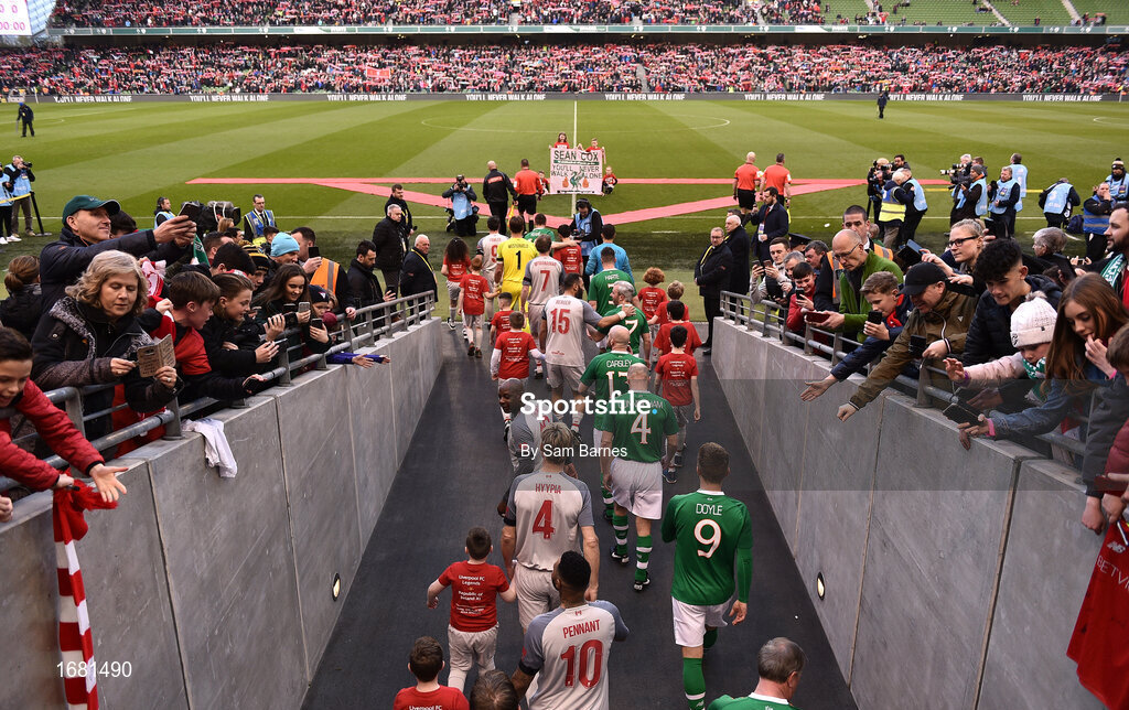 12 April 2019; The two teams make their way out onto the pitch prior to the Sean Cox Fundraiser match between the Republic of Ireland XI and Liverpool FC Legends at the Aviva Stadium in Dublin. Photo by Sam Barnes/Sportsfile