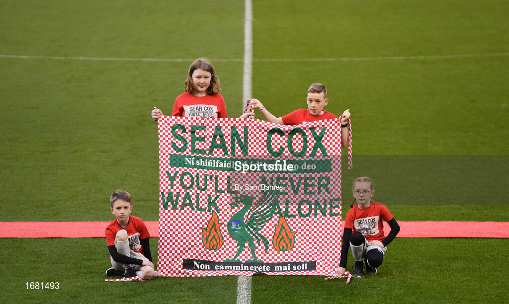 12 April 2019; Mascots with the Sean Cox flag prior to the Sean Cox Fundraiser match between the Republic of Ireland XI and Liverpool FC Legends at the Aviva Stadium in Dublin. Photo by Sam Barnes/Sportsfile
