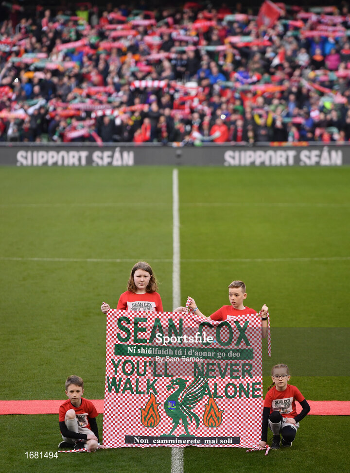 12 April 2019; Mascots with the Sean Cox flag prior to the Sean Cox Fundraiser match between the Republic of Ireland XI and Liverpool FC Legends at the Aviva Stadium in Dublin. Photo by Sam Barnes/Sportsfile